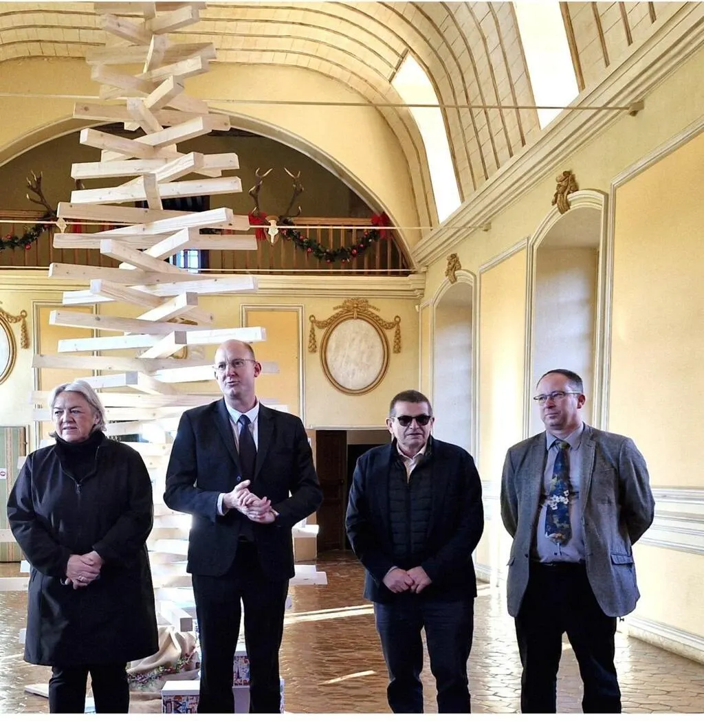 Hier, les officiels ont inauguré l’arbre à vœux, un sapin en bois de 5 m de haut fabriqué et installé par l’atelier bois du lycée Giel-Don-Bosco. Trônant fièrement dans la salle des fêtes du château, il va accueillir tous les messages des visiteurs. Des étiquettes placées à son pied permettront d’écrire les vœux et de les accrocher dans le sapin.