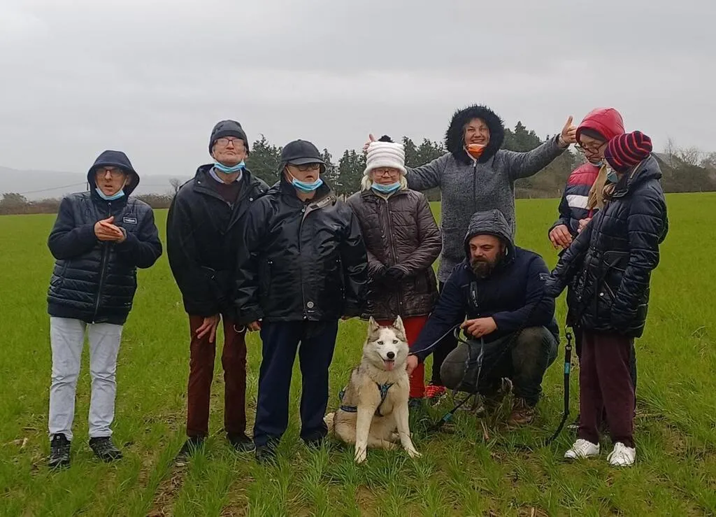 Après plusieurs séances de sensibilisation autour de l’univers du mushing (meneur de chiens), ils se sont rendus en Mayenne une matinée avec la Team Ice Wolfs mushing. Le musheur Jocelyn Lenormand (coach canin spécialisé dans le chien nordique) et Laurence Fabre (praticienne en psychothérapie, spécialisée en médiation animale) ont su faire partager leurs émotions. Les résidents ont fait une heure trente de balade dans un champ au contact de Mayha (ils ont pu diriger eux-mêmes le chien). Ils ont appris le vocabulaire et les techniques de dressage. Et ils ont forcément craqué pour cette chienne si intelligente. Une belle rencontre, et malgré le handicap ou l’âge qui avance, ils ont eu la sensation que tous les rêves sont permis. Actuellement tout le monde prépare activement le prochain séjour à la mer.