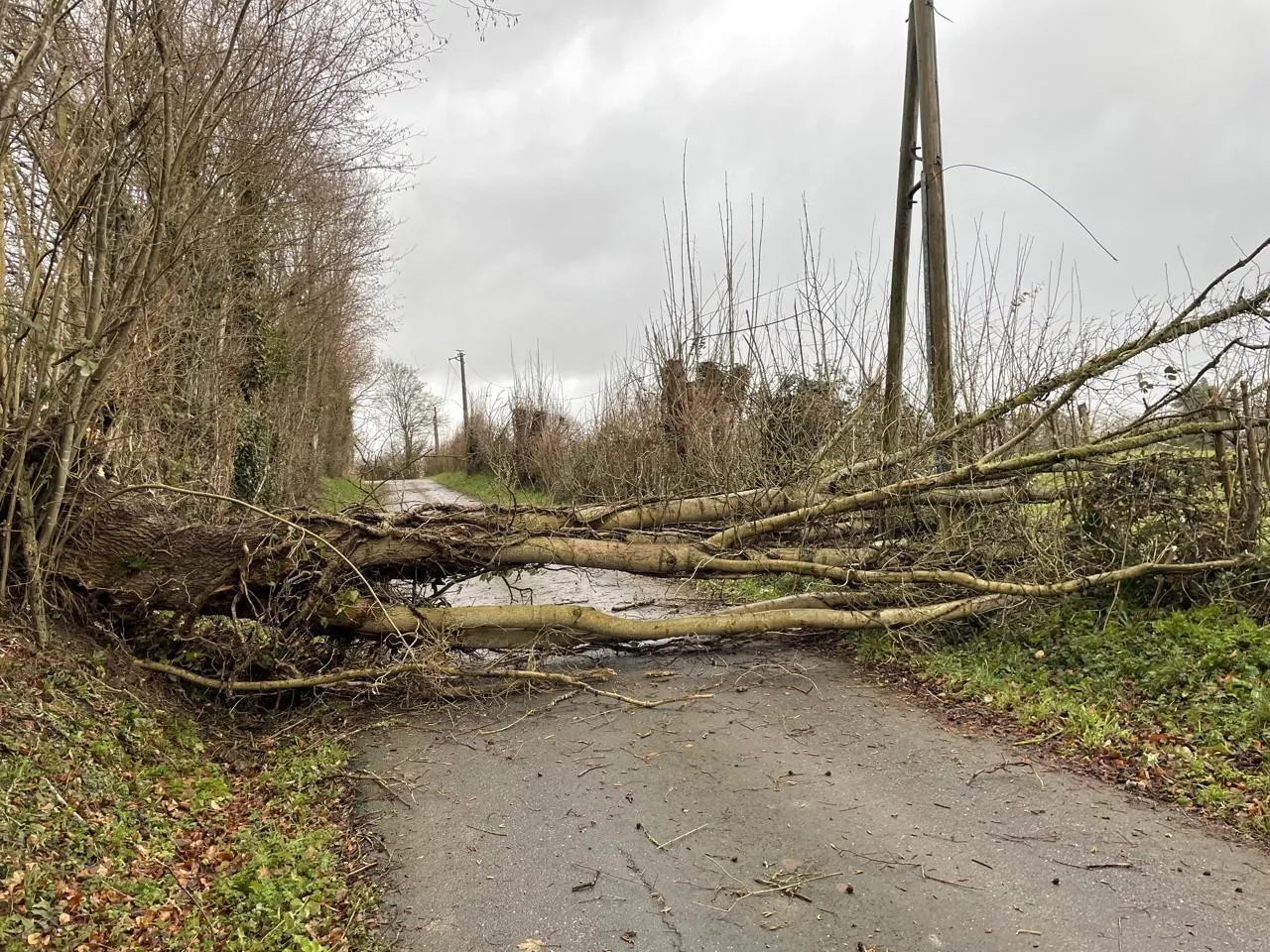 La tempête Goretti a soufflé dans la nuit de jeudi 8 à vendredi 9 janvier 2026 en Normandie et a fait tomber quantité d’arbres, comme ici près de Lisieux. © Ouest-France