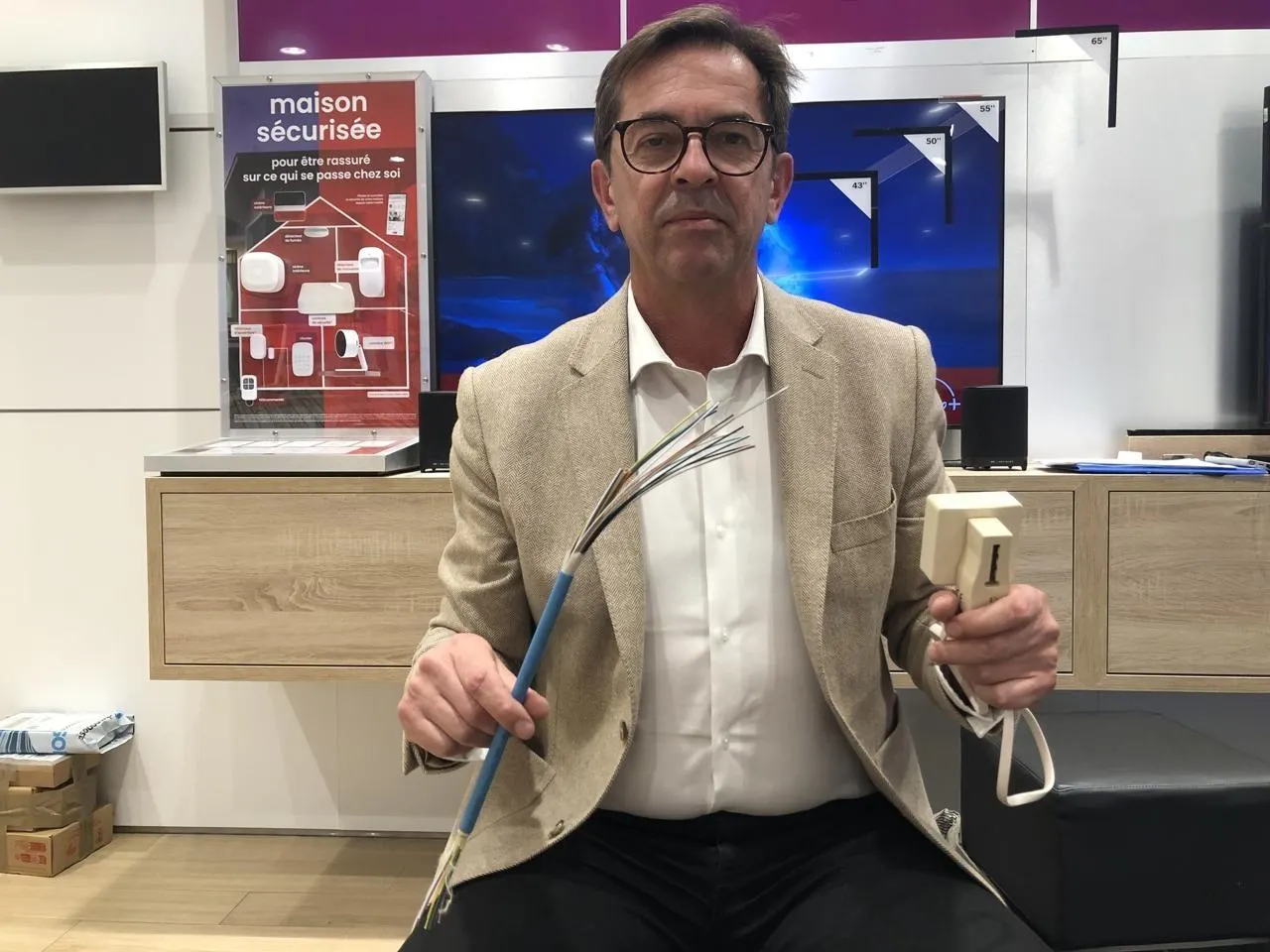 Franck Coudrieau, délégué régional Ouest Altice-SFR, tient dans sa main droite un raccordement fibre et dans sa main gauche un ancien raccordement ADSL. © Ouest-France