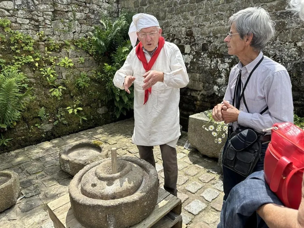 Claude Boscher (à gauche) a pu expliquer comment faisaient nos ancêtres pour faire de la farine avec des moulins à bras. © Ouest-France