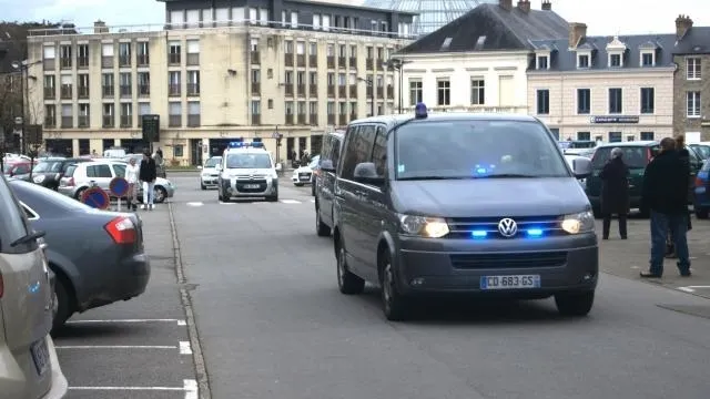 Trois véhicules de polices étaient chargés de sécuriser les lieux à l'arrivée au palais de justice de Youssouf Fofana. © Ouest-France