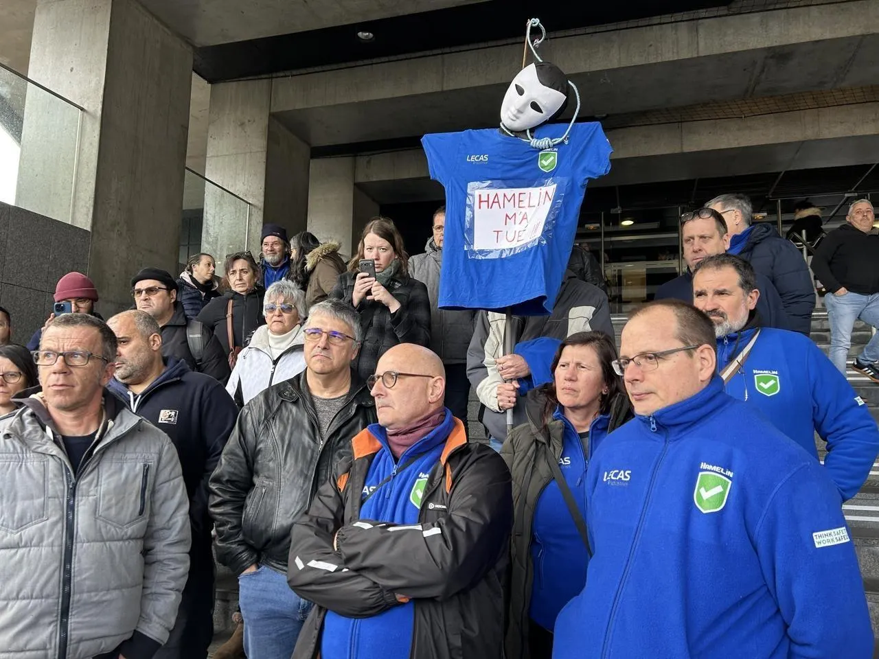 Vêtus de leur polaire bleue de travail, une trentaine de salariés de Lecas Industries, filiale du groupe caennais Hamelin, ont assisté à l’audience de la cour d’appel de Caen, ce jeudi 12 février 2026. © Ouest-France