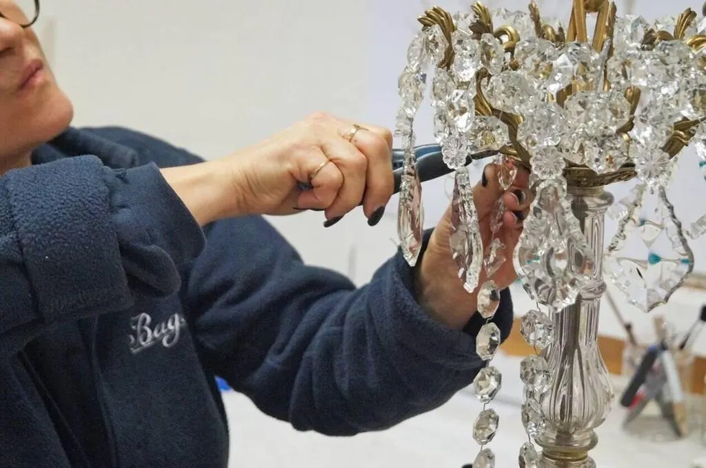 Carole Besnard détache et remplace une à une les attaches des cristaux d’un lustre pour le rénover. Ouest-France