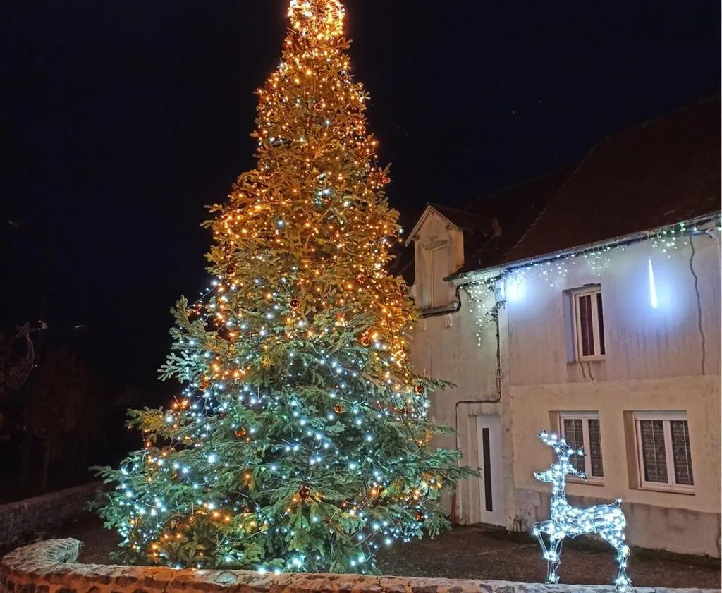Le sapin décoré par le comité des fêtes illumine le bourg. © Ouest-France