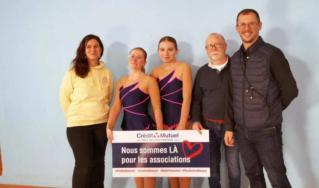 Maud Nicole, la présidente du club ; deux gymnastes, présentant le nouveau justaucorps ; Michel Bréard et Sandy Prunier, respectivement administrateur et directeur de la caisse locale du Crédit mutuel. © Ouest-France.
