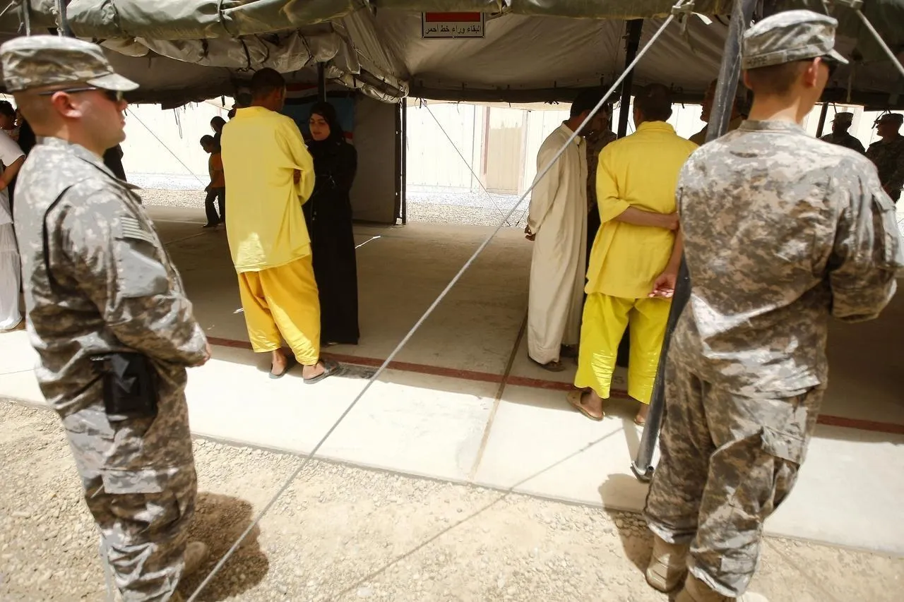 Des soldats américains montent la garde dans le centre de détention de Camp Cropper (ici photographié en 2009) que les cinq jeunes venus de France ont rejoint ces derniers jours. © AHMAD AL-RUBAYE / AFP