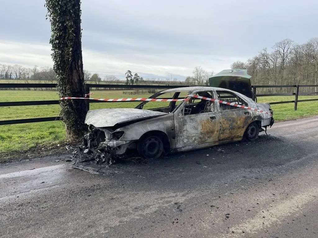 Une des voitures incendiées, retrouvée au lieu-dit Le Tellier à Sévigny, samedi 8 mars. © Ouest-France