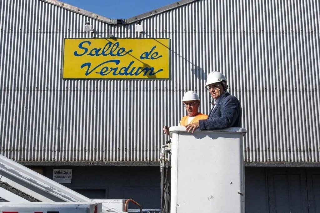 Le maire, Philippe Van Hoorne a pris place dans la nacelle afin de décrocher la plaque « Salle de Verdun », vieille dame de tous les instants culturels depuis les années soixante… au XXe siècle ! © Ouest-France