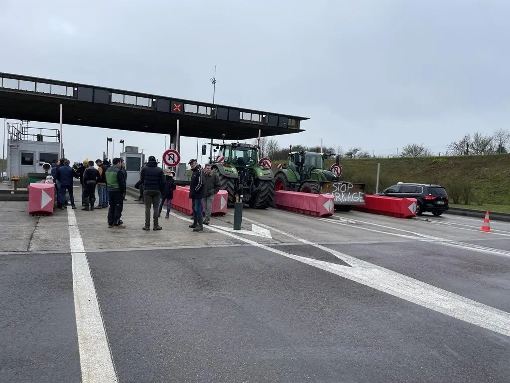 Depuis 10 h, jeudi 8 janvier 2026, neuf tracteurs, non attelés, occupent le péage de Ronai sur l’A88, près d’Argentan (Orne) dans le sens Ronai-Alençon. Les barrières sont ouvertes pour laisser circuler camions et voitures gratuitement.