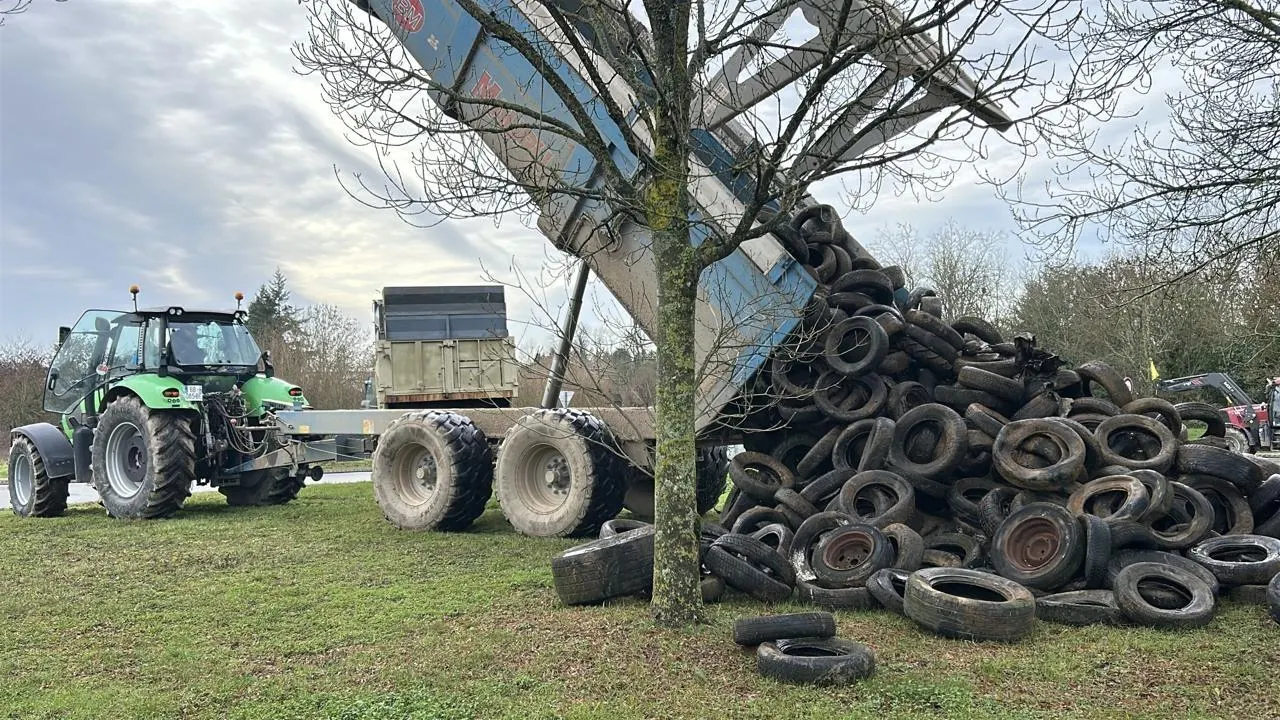 Les agriculteurs déversent pneus et lisier sur le rond-point de l’aire de la Dentelle, à Alençon (Orne), ce vendredi 19 décembre 2025. Ouest-France
