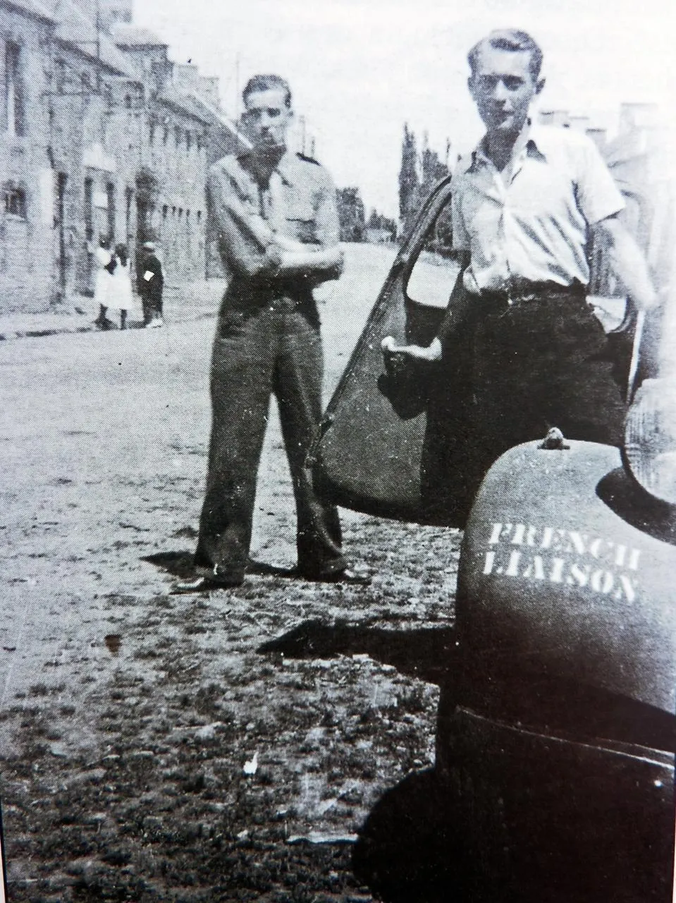 Libération de Montsecret. Roger Aubry, réfractaire au STO et membre du réseau Navarre en Mayenne, rentre chez sa mère à Montsecret, dans une voiture de liaison administrative française. C’est une photo rare montrant que certains réfractaires au STO de la région de Tinchebray sont bien rentrés dans la Résistance à partir de fin 1943. © (Collection Solange Dumarais, née Aubry)