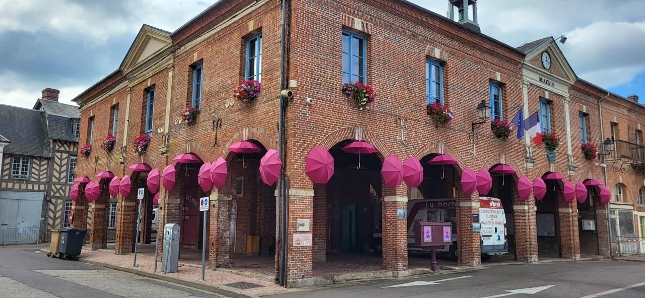 Des parapluies roses autour des halles de l’hôtel de ville de Sap-en-Auge (Orne). © Ouest-France