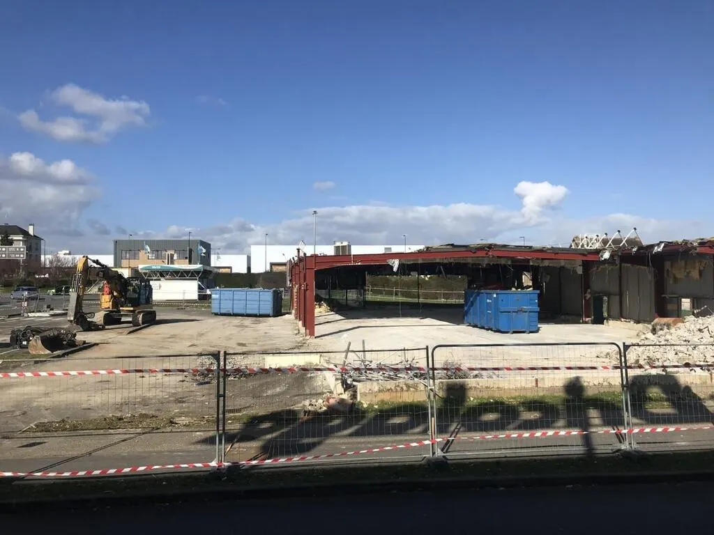 Les travaux de démolition de l’ancien bâtiment ont débuté sur le site qui va accueillir Burger-King, dans la zone commerciale de Carrefour à Condé-sur-Sarthe. © Ouest-France