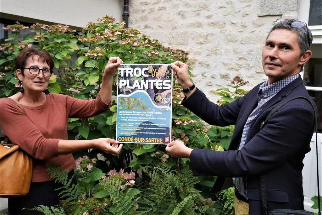 Les élus, Gwenaëlle Ouvrard et Luc Buffler, présentent l’affiche du 5e Troc tes plantes. © Ouest-France