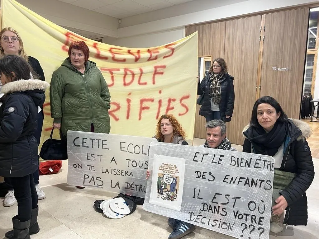 Le soir du conseil communautaire, le 21 décembre, les parents d’élèves de l’école La-Fontaine attendaient les élus avec des banderoles et des panneaux. © Ouest-France