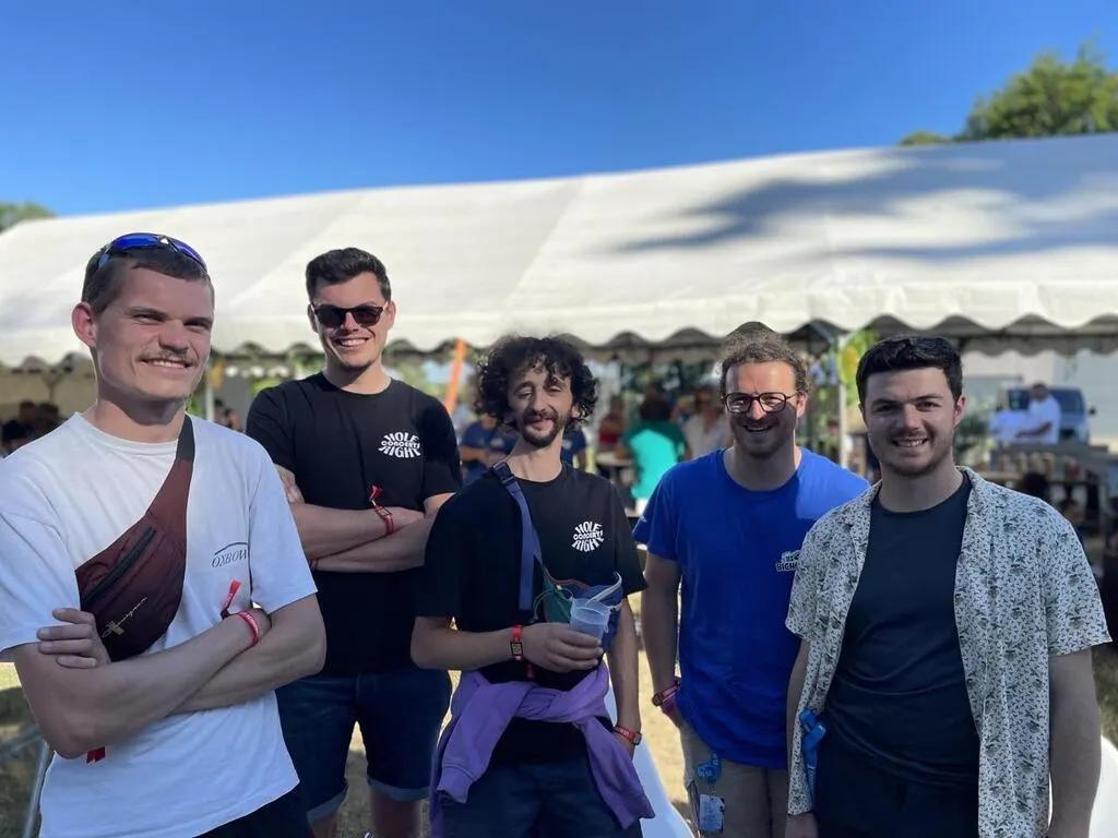 Brice Loupil, Mathieu Dary, Malo Pereira, membre du collectif Hole Right et Henri et Guillaume Dubreuil du festival 61 degrés, étaient déjà présents au festival des Bichoiseries à Cerisy-Belle-Étoile, dans l’Orne, avant d’animer le camping d’Art Sonic le samedi 19 juillet 2025. © Ouest-France