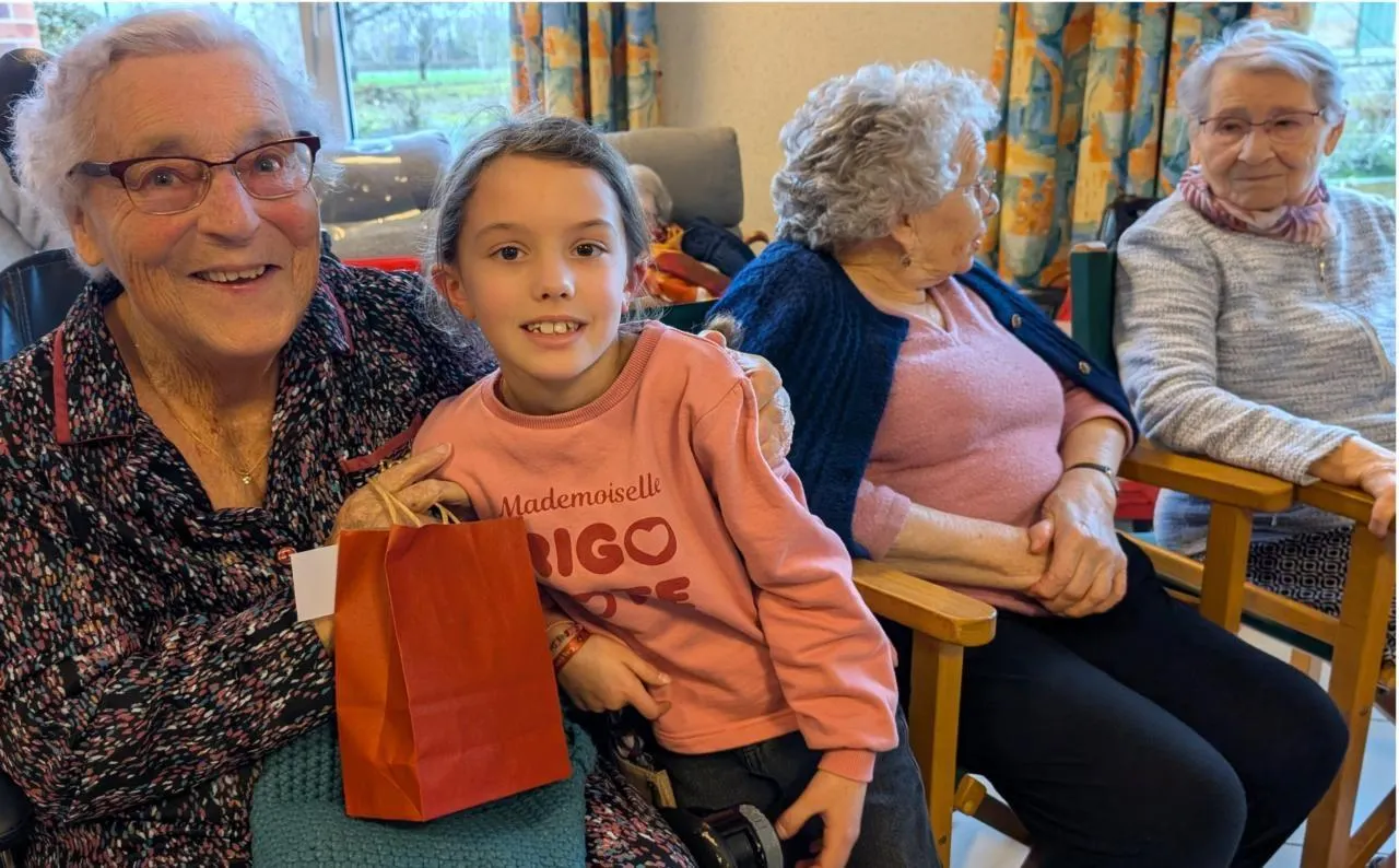 Thérèse Vallée, une aînée aux doigts de fée, remercie chaleureusement la petite Jeanne pour soncadeau. © Ouest-France
