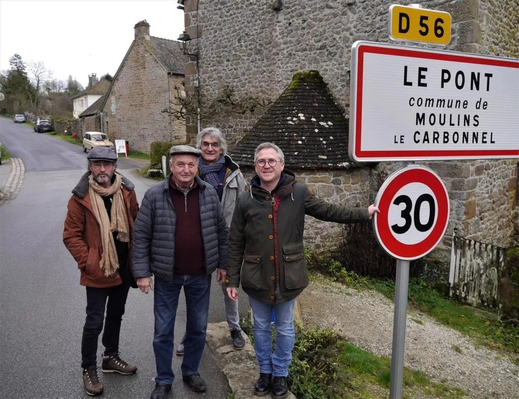 Marc Chatain des Amis de Saint-Céneri, Arsène Guilmeau, adjoint, Patrick Bouleau, artiste, Richard Marquet, maire, de gauche à droite, devant les panneaux de la discorde, implantés à la sortie du vieux pont en direction de Moulins le Carbonnel © Ouest-France