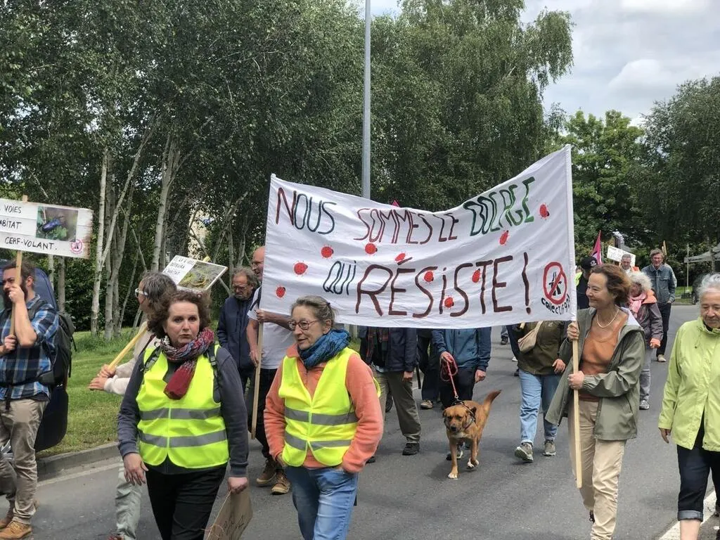 Pour protester contre la construction du dernier tronçon de la 2x2 voies Flers-Argentan, 80 manifestants se sont mobilisés à Briouze (Orne), samedi 22 juin 2024.