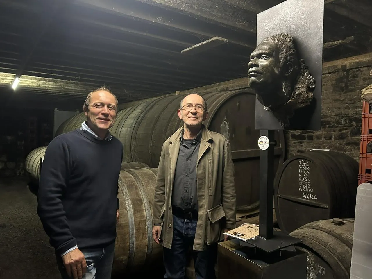 Jean-François Huard (à gauche) et Jean-Michel Huard (à droite) commencent la visite avec un bronze de Samuel Vandégou, descendant d’une famille de Kanaks (peuple autochtone de Nouvelle-Calédonie). © Ouest-France