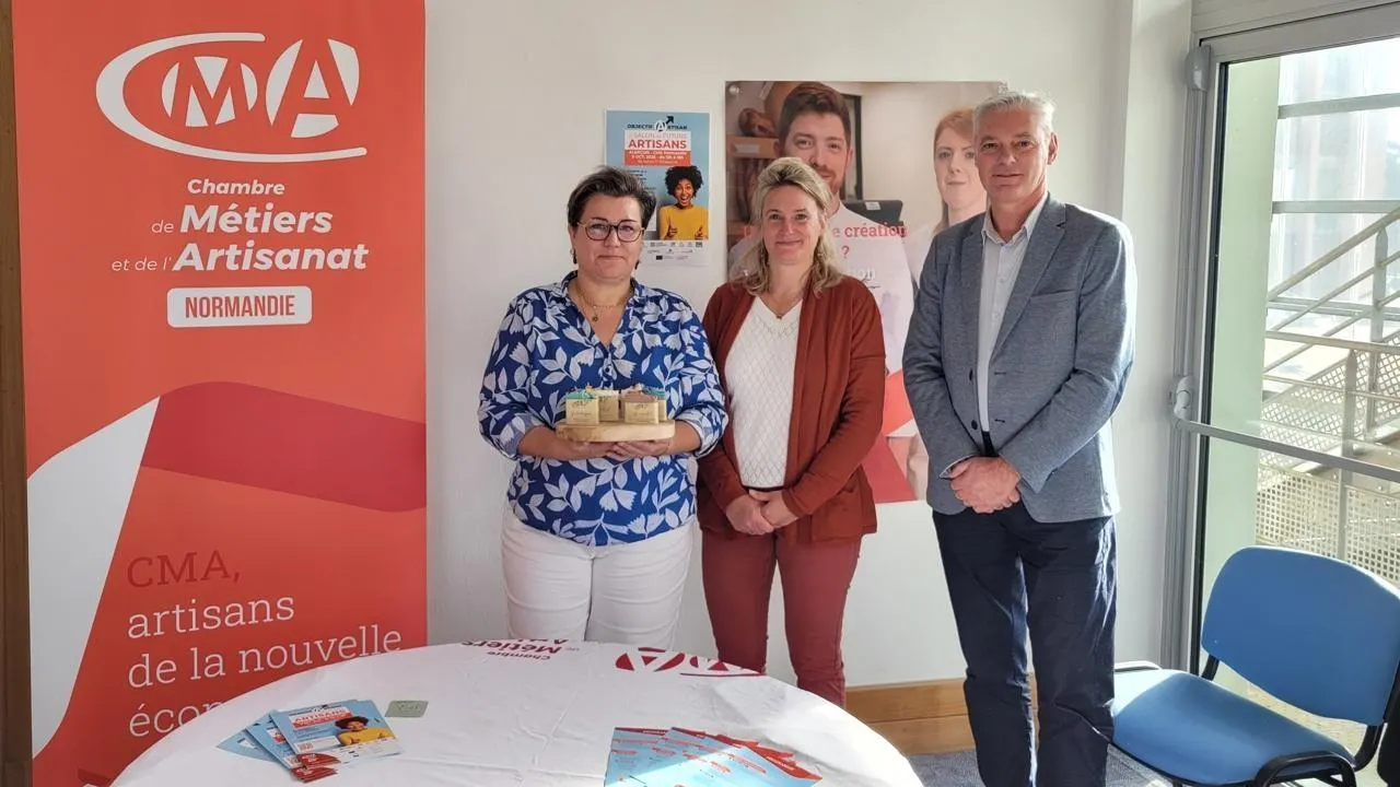 De gauche à droite : Catherine Gomes, artisane savonnière, Stéphanie Choplin, assistante de direction, et Vincent Chapelain, directeur territorial. © Ouest-France