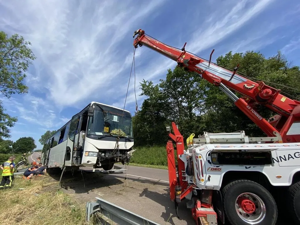 Un bus transportant 26 élèves a terminé sa course sur le rail de sécurité, ce mercredi 31 mai 2023, sur la nationale 12 au lieu-dit La Butte rouge à Gandelain (Orne). Des moyens sont engagés pour extraire le véhicule. © Oues-France
