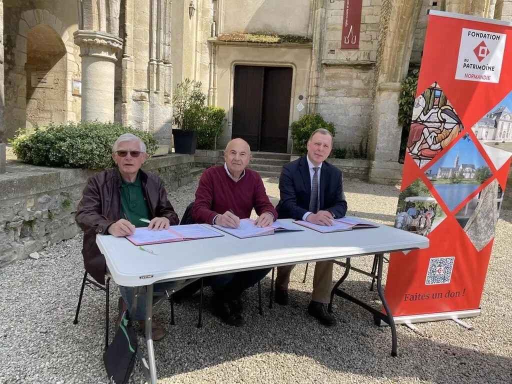 Les signataires de la convention : Louis Hamel, président de l’association Architecture et patrimoine, Alain Lolivier, maire d’Écouché-les-Vallées, et Richard Guibert, membre de la délégation ornaise de la Fondation du patrimoine. © Ouest-France