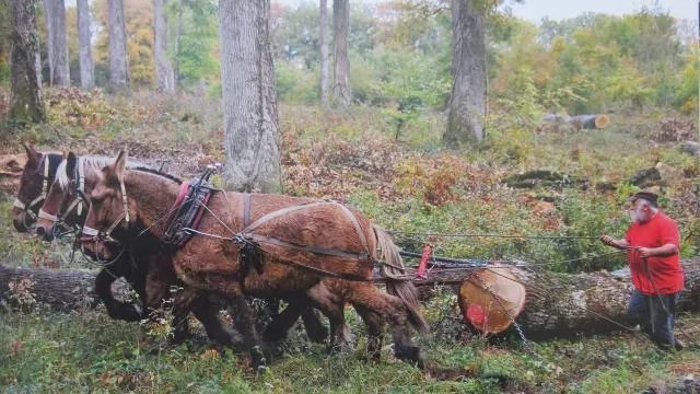 Débardage de grumes par deux chevaux et une mule : la traction animale est utilisée quand les engins mécaniques ne peuvent intervenir. © DR