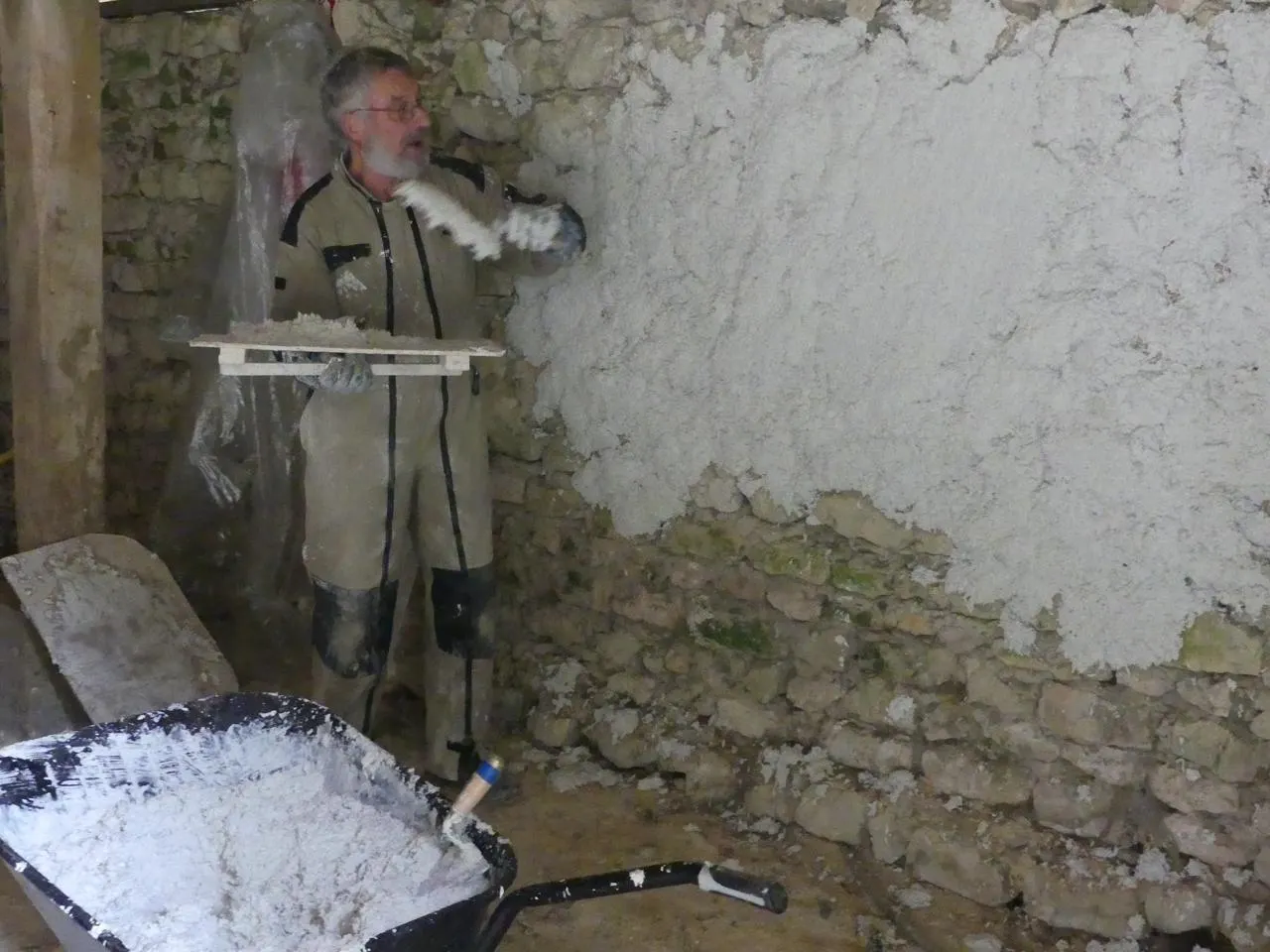 C’est la seule façon de respecter la nature, en permettant un échange de vapeur d’eau sans avoir besoin de poser une membrane. Il y a comme une réserve d’eau dans le mur, c’est plus confortable », explique Luc Nieuwenhuyze tout en projetant habilement le mortier à la truelle sous les yeux des professionnels. « C’est la première fois de ma vie que je travaille sans membrane plastique ni ruban adhésif »,