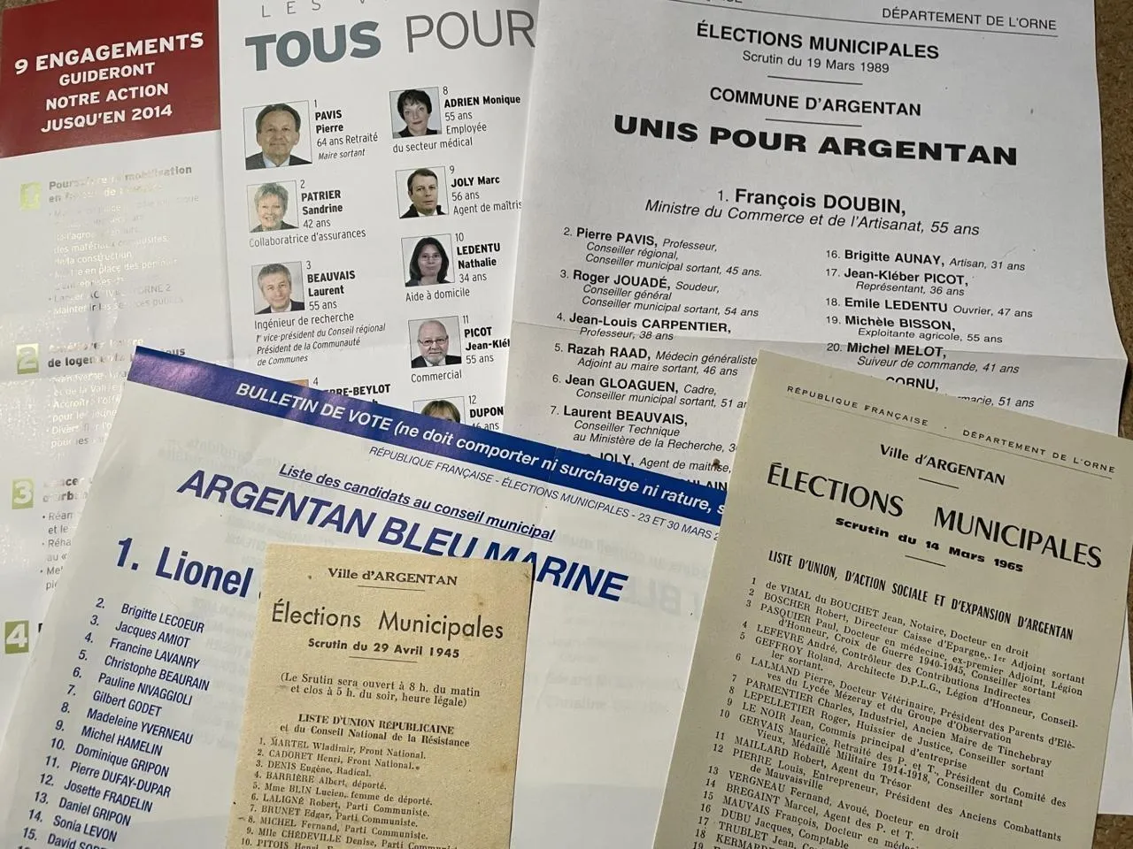 Des bulletins de vote de différents scrutins municipaux à Argentan, entre 1945 et 2014. © Collection François Boscher