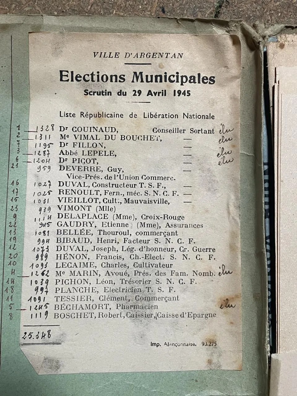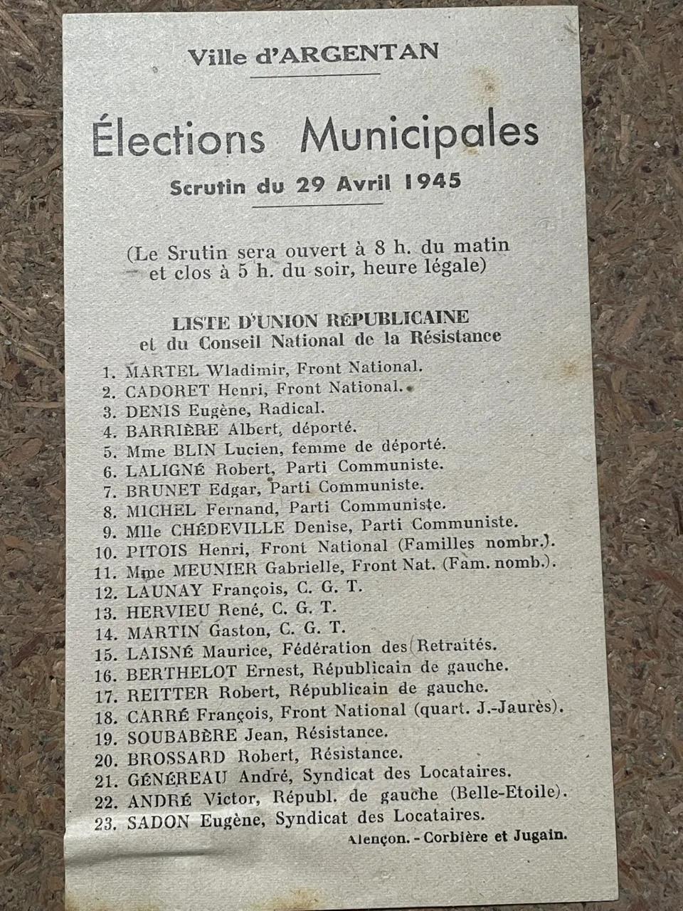 Élections municipales à Argentan : un bulletin de 1945 de la liste de gauche. Collection François Boscher