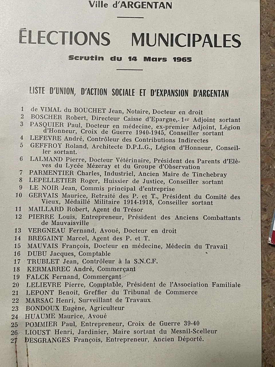 Le bulletin de la liste Vimal du Bouchet lors des municipales 1965 à Argentan. Collection François Boscher