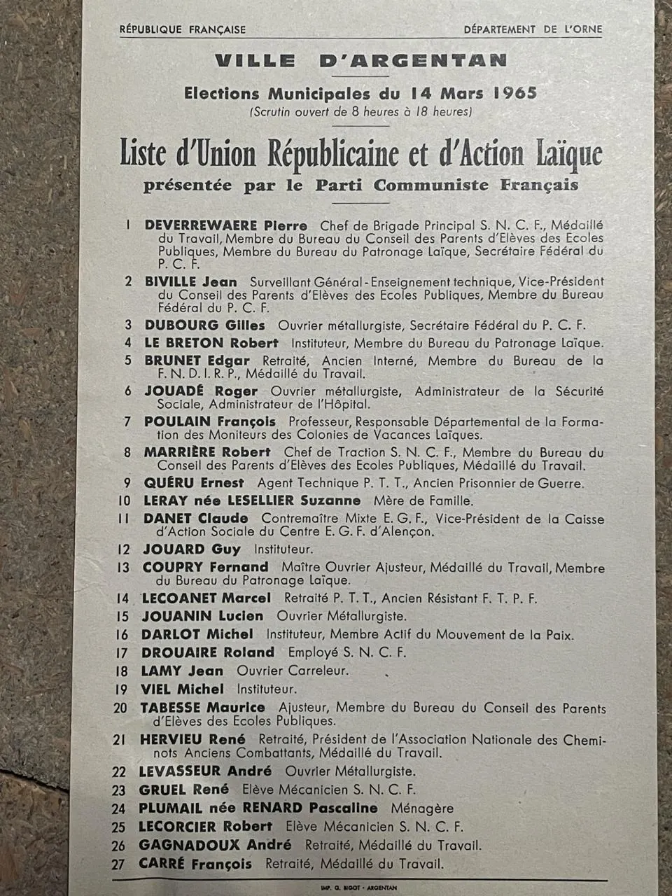 Élections municipales à Argentan en 1965 : bulletin de la liste de gauche. Collection François Boscher