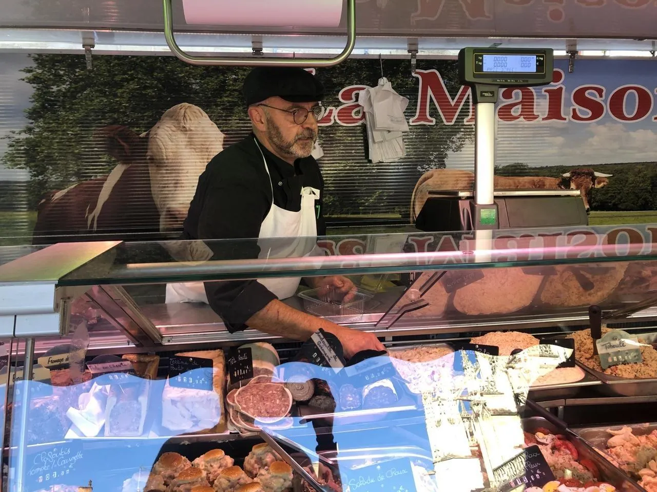 « Nos éleveurs, ce sont nos patrons », annonce fièrement Jacky Mortier derrière son stand de boucherie, sur la place de la Magdeleine à Alençon (Orne). Le boucher est présent tous les jeudis et samedis pour le marché depuis trois ans.