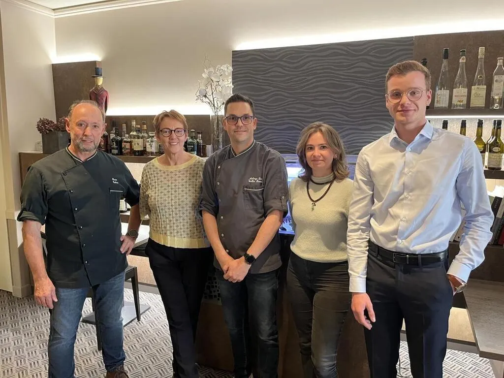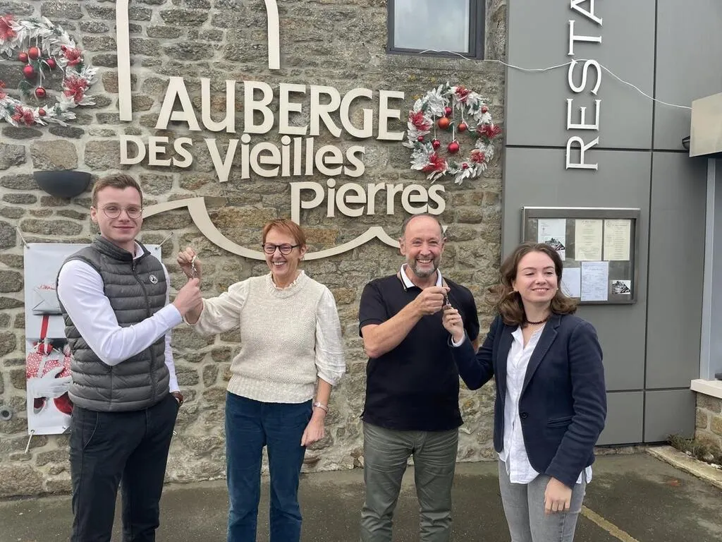 Jeanne-Marie Cesbron et Xavier Cesbron (au centre) ont vendu leur restaurant l’Auberge des vieilles pierres à Julien Auvray (à gauche) et sa sÅ“ur Charlotte Auvray, ce mardi 3 décembre 2024. © Ouest-France