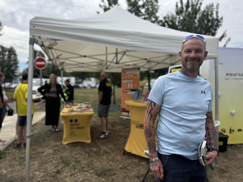 « Ah, encore un Nordiste ! Vous venez d’où ? » Au stand du bureau de la Sécurité routière, samedi 5 juillet 2025, Christian Mouillon est accueilli à bras ouverts par les intervenants départementaux présents sur l’aire d’autoroute d’Alençon (Orne).