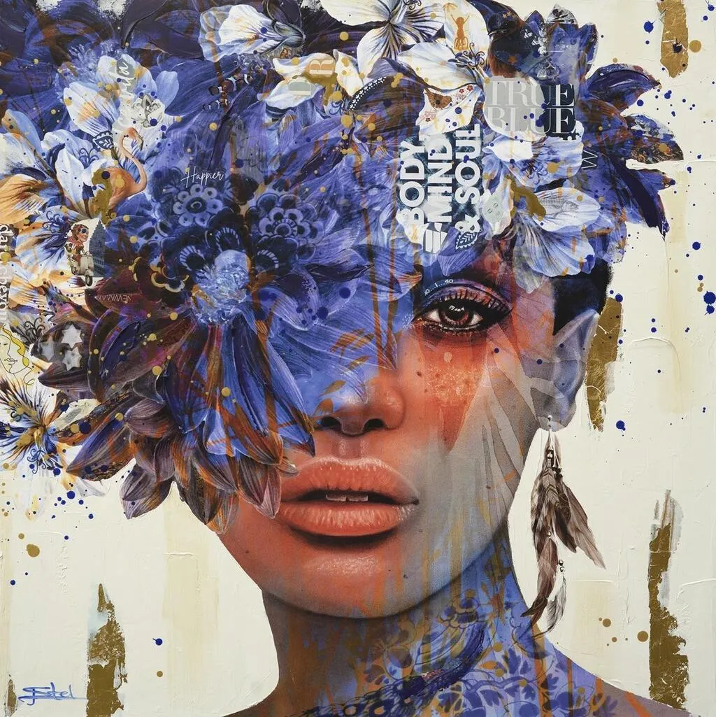 Jorien Stel éalise des œuvres d’art surprenantes. De loin, chaque peinture semble être une composition équilibrée ; mais, de près, ce sont les mots, les histoires et les petits détails qui donnent vie à chacune. Les matériaux que j’utilise sont un mélange de techniques numériques, combinées à des photos, des magazines recyclés, des feuilles d’or et de la peinture acrylique