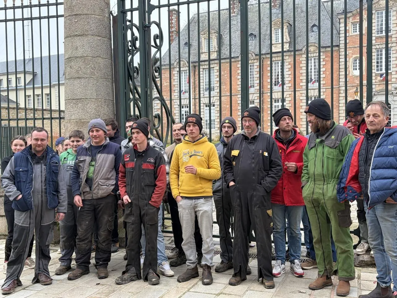 Les agriculteurs se sont arrêtés devant la préfecture de l’Orne pour protester contre la non-venue du préfet. © Ouest-France