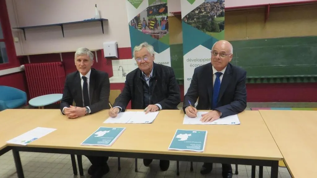 Président de la CDC et membres de la CAF signent la convention © Ouest-France