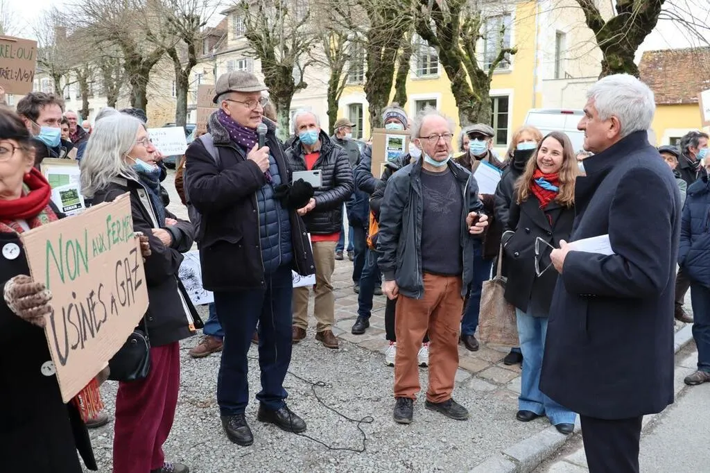 Plusieurs associations avaient manifesté lors de la présentation du projet à Mortagne-au-Perche, le 10 février 2022, en présence du président de la Région, Hervé Morin. © Ouest-France