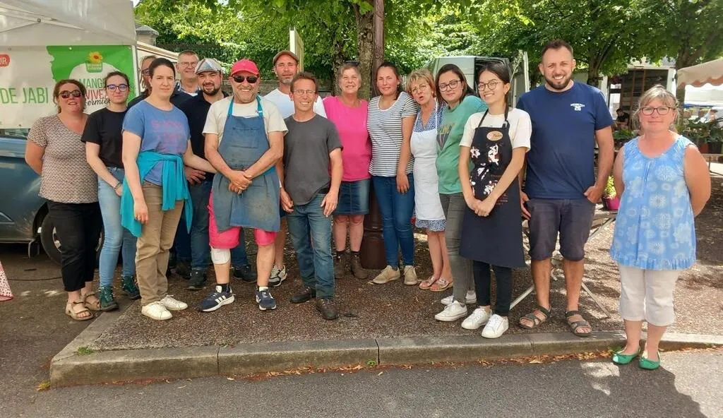 Chacun a sa place autour de la place et dans la rue bloquée pour l’occasion. Lui est sous les arbres proches du fromager des Chèvres de chez Jabi, entre l’imposant camion boucherie charcuterie du Cochon doré, les producteurs de légumes du Cercueil de Laurence et François Lepetit ou encore la famille Benmessaoud, marchands de fruits.