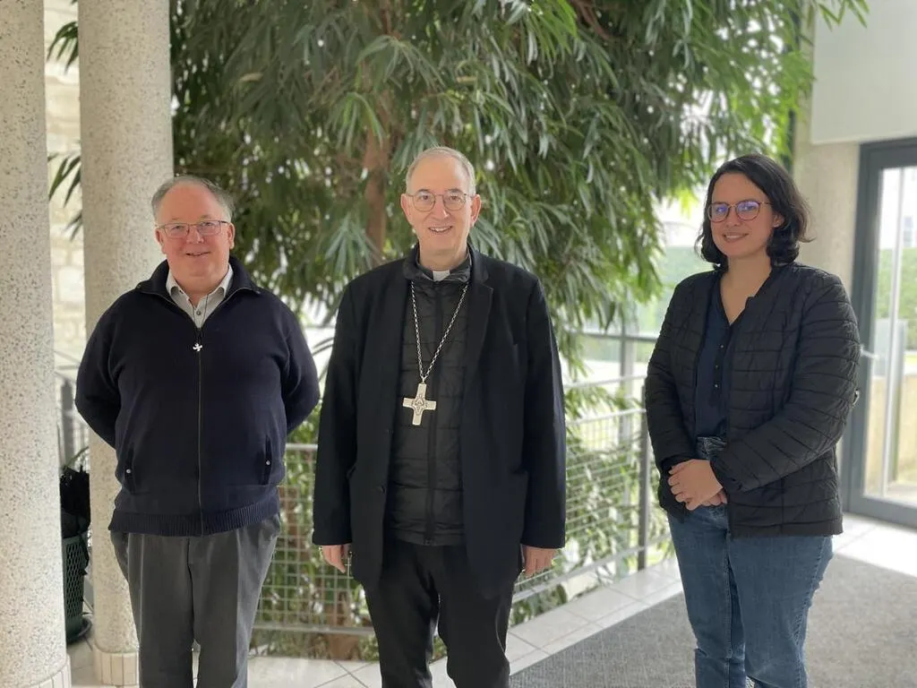 De gauche à droite : l’abbé Philippe Pottier, vicaire général, Mgr Bruno Feillet, évêque de Séez, Violaine d’Aillières, responsable de la communication du diocèse de Séez. © Ouest-France