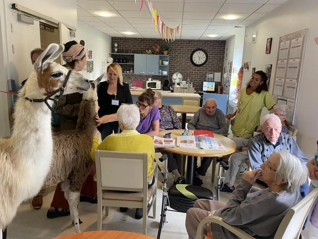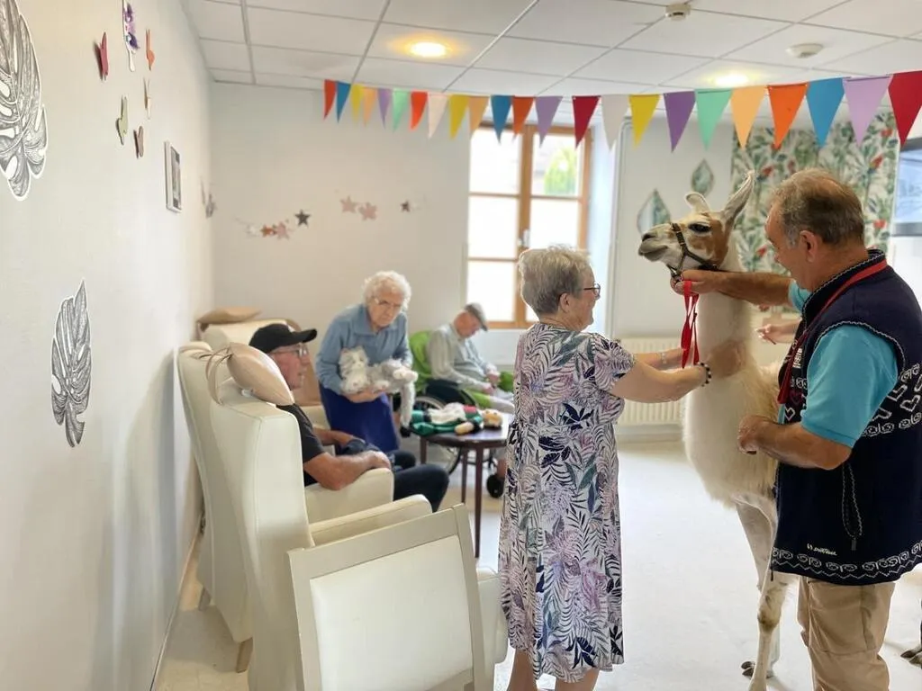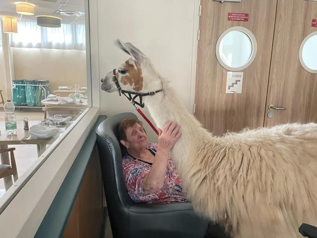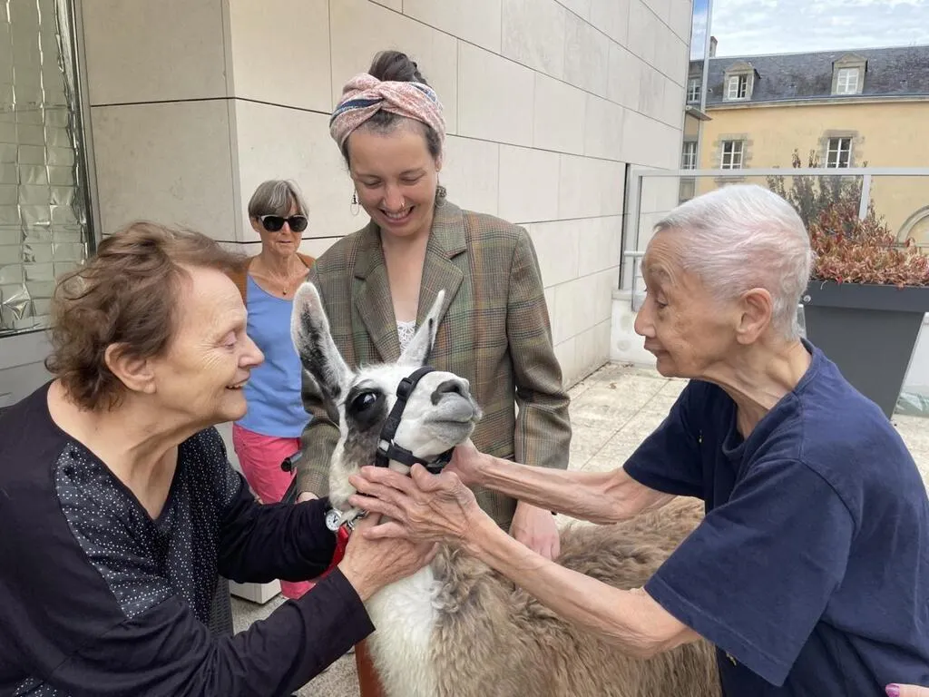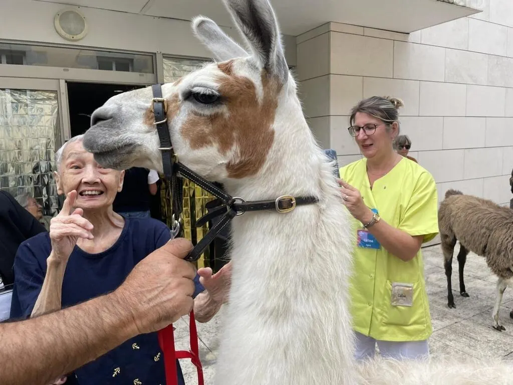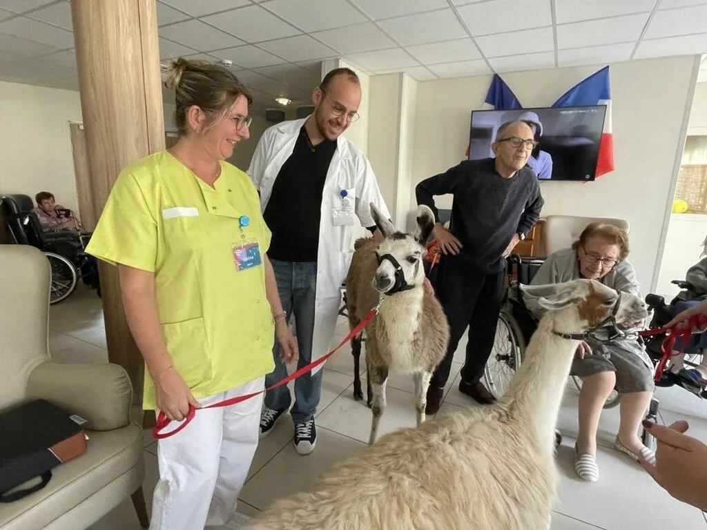 Les résidents de l’Ehpad de la Sénatorerie, à Alençon (Orne), ont reçu la visite de deux lamas, vendredi 6 septembre 2024. Anne Corriaux, animatrice dans l’établissement a régulièrement recours à la médiation animale pour favoriser le dialogue et les échanges.