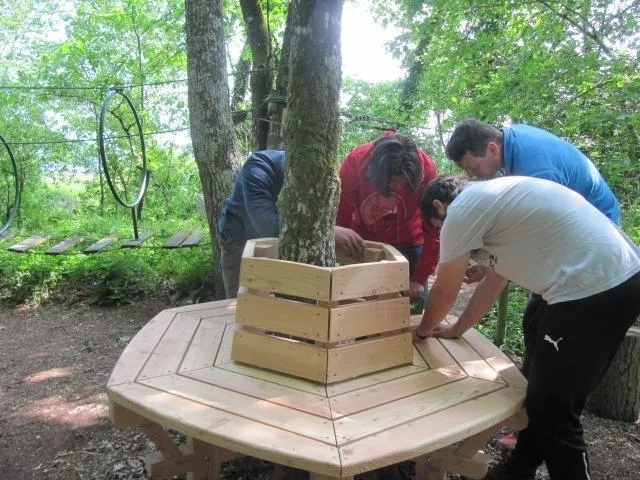 Des lycéens menuisiers construisent un banc pour le parc accrobranche de La Roche d’Oëtre... |