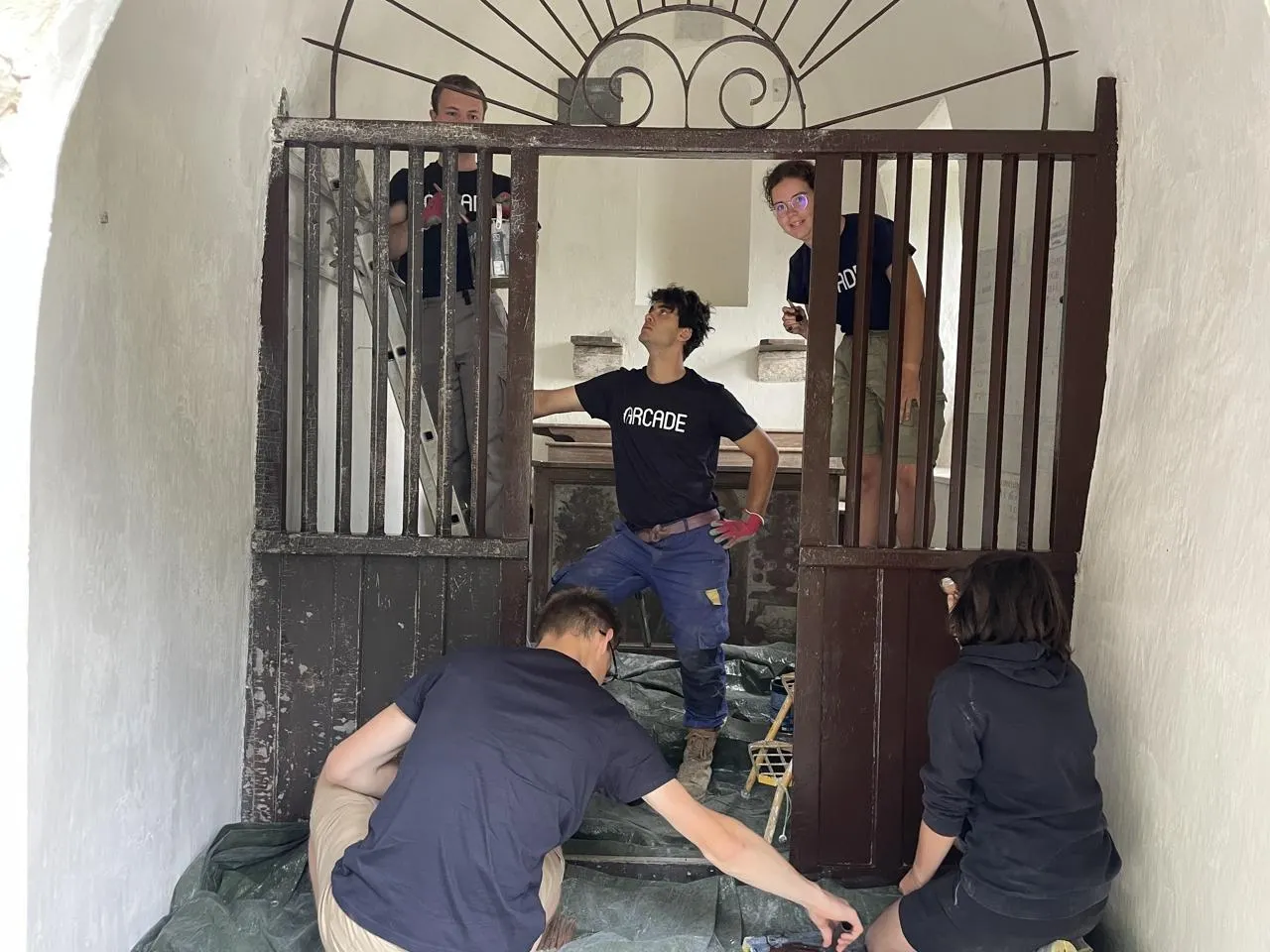 Les deux amies, Jeanne et Éléna, 20 ans, donnent les derniers coups de pinceaux à la chapelle des Treize-Saints, à Écouché-les-Vallées. © Ouest-France