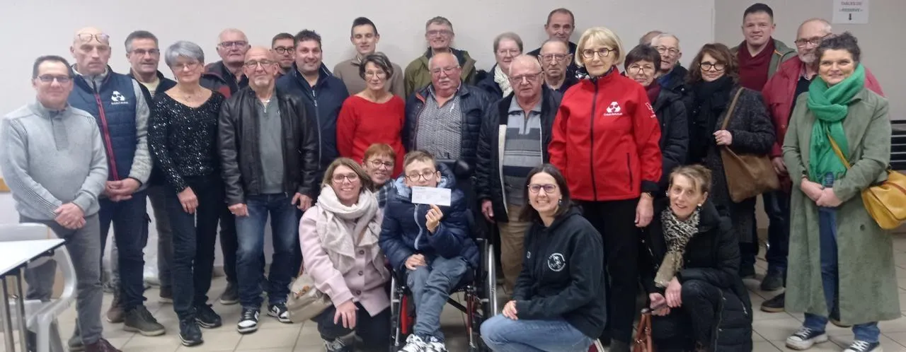 Raphaël, entouré de l’équipe de La Margantinaise, montrant le chèque de 400 € récoltés pour l’achat de matériel adapté à sa maladie neurologique. © Ouest-France