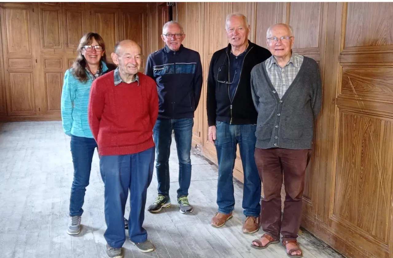 Frédérique Passays, bénévole ; Louis Philippe, le vice-président ; Didier Gaillard, bénévole ; Marcel Folliot, le président, et Jacques Roger, le secrétaire, dans la salle de l’oratoire avant l’installation de l’exposition. © Ouest-France