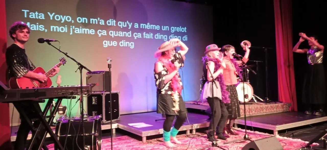 Trois participantes très motivées dans cette ambiance cabaret, accompagnées des musiciens professionnels du Préau, centre dramatique national Normandie, à Vire. © Ouest-France