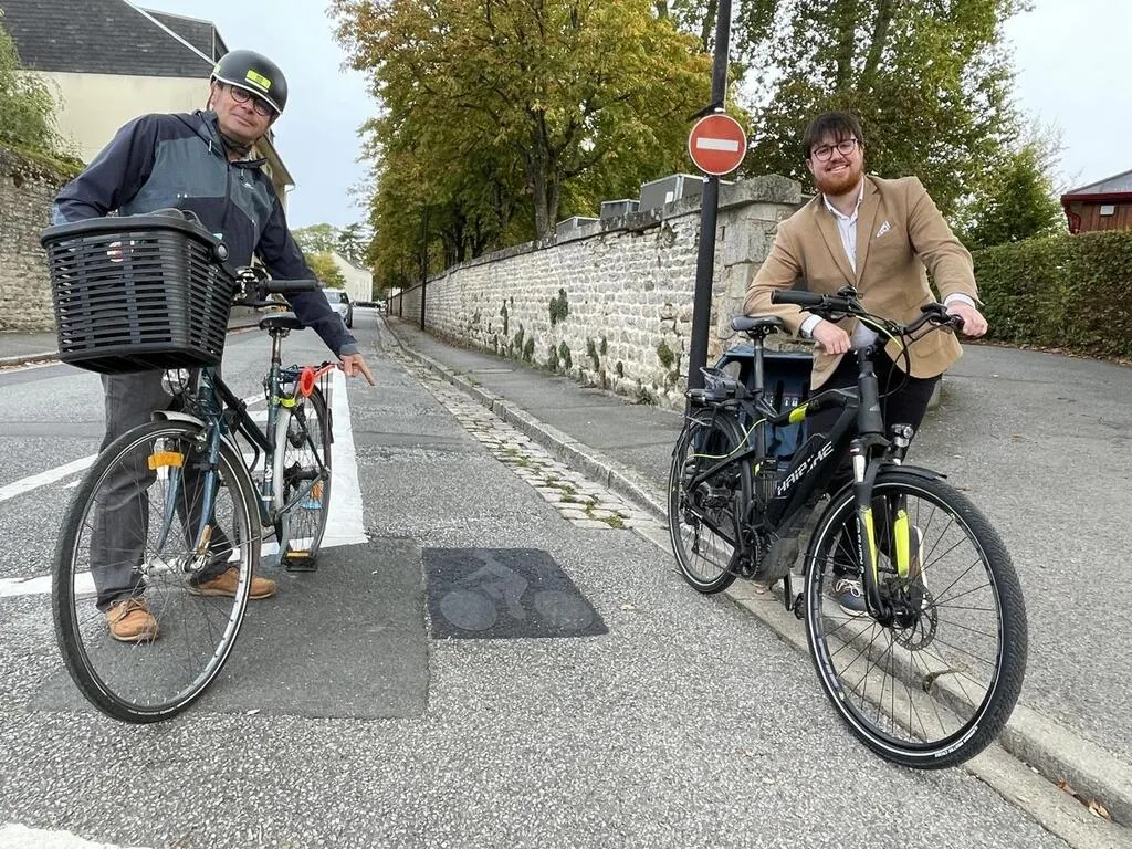 Thierry Churin et Piers Barrios, vice-président et président de l’association A Bicyclette, rue Candie, à Alençon, où un double sens cyclable a été installé puis désinstallé dix jours plus tard. © Ouest-France